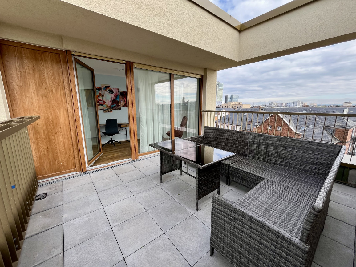 Insgesamt bietet das Penthouse 3 Schlafzimmer, 1 Wohnzimmer, 1 Küchen, 2 Bäder, 2 Balkone, 1 Terrasse und eine Dachterrasse.